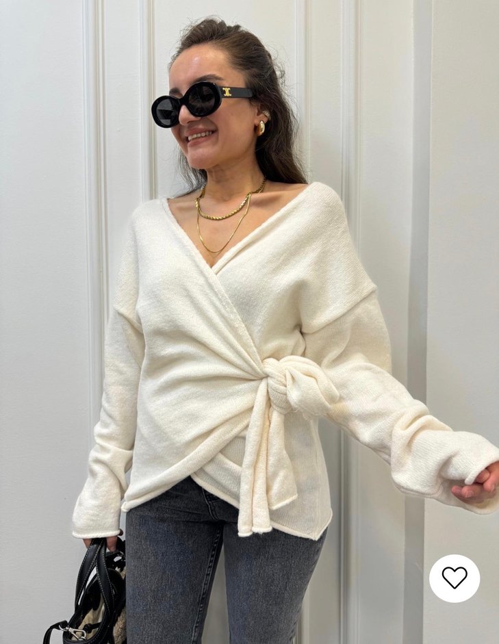 Beyaz renkte, V yakalı, örgü kumaştan yapılmış, bağlamalı ve salaş kesime sahip uzun kollu rahat bir kazak.