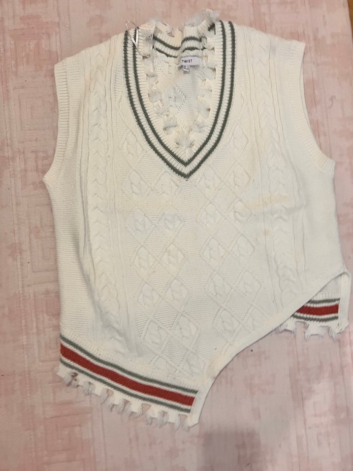 Beyaz renkli, V yaka, örgü dokulu, kolsuz ve vücuda oturan süveter. Asimetrik etek ucu ve çizgili detaylarıyla sokak modasına uygun.