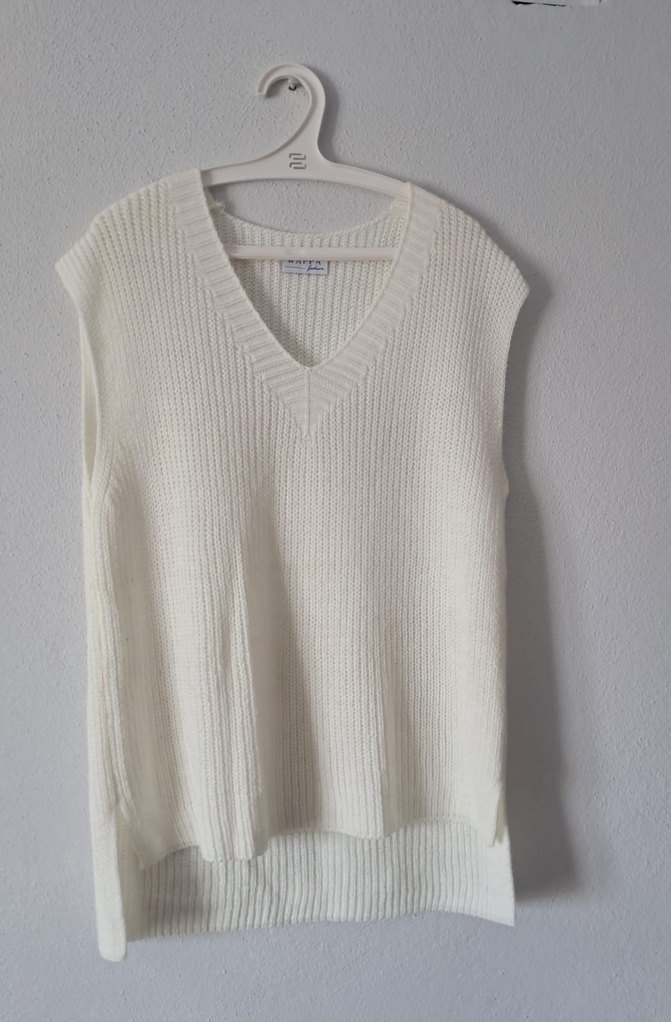 Beyaz renkte, V yaka ve kolsuz örgü süveter. Normal midi boyda, bol kesim ve sade tasarıma sahip, günlük kullanıma uygun rahat bir parça.