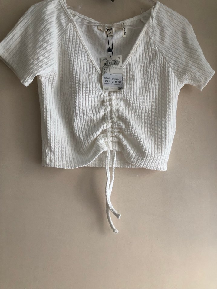 Kız çocukları için beyaz, v yaka ve kısa kollu, örme keten kumaştan yapılmış, hafif baskılı desenli, fitted kesim ve ön kısmı büzgülü bluz.