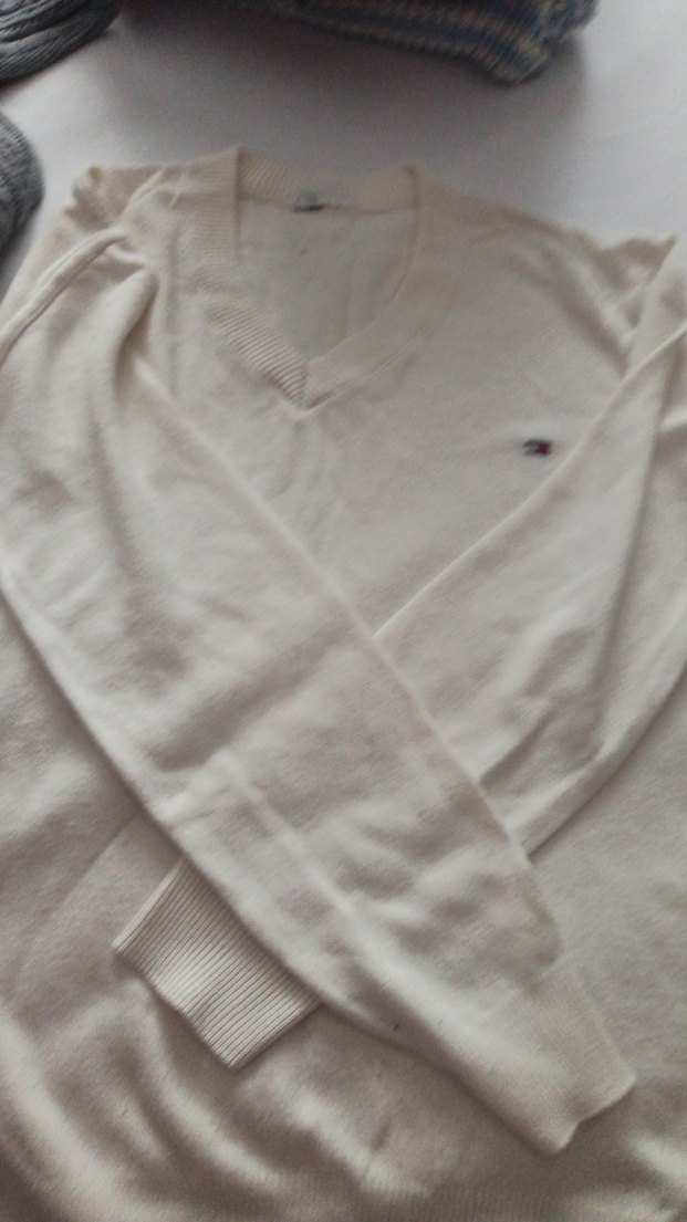 Beyaz renkte, pamuklu kumaştan, V yaka ve uzun kollu, bol kesim kadın kazak. Minimalist ve rahat şıklık sunar.