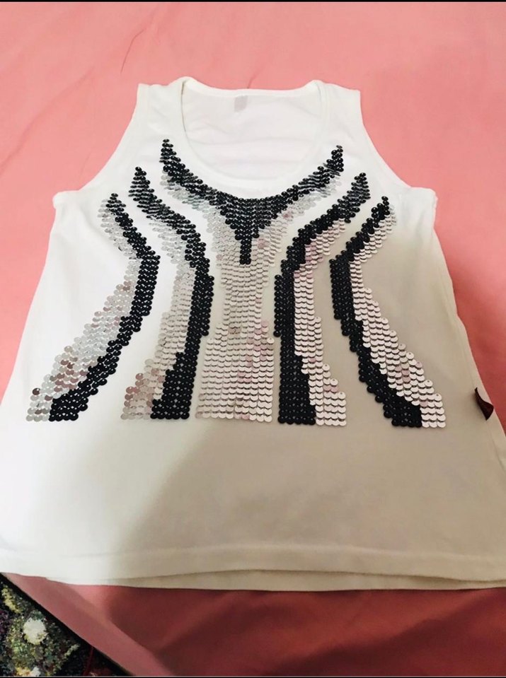 Beyaz, V yakalı, kolsuz, vücuda oturan atlet. Siyah ve gümüş payet desenleriyle sokak modasına uygun✨