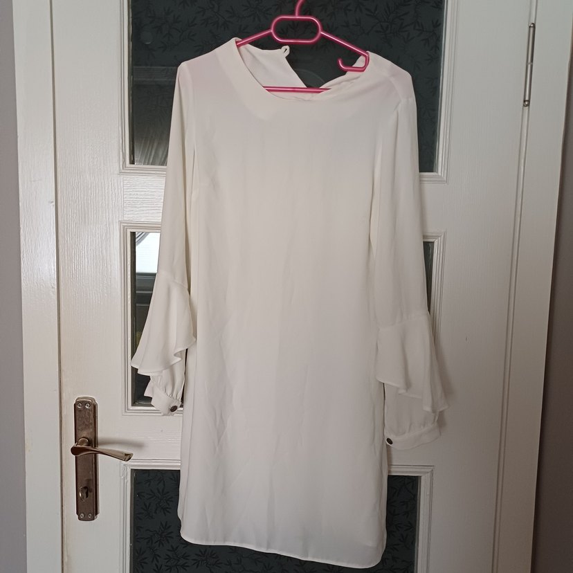 Beyaz midi tunik, uzun kollu ve V yaka drapeli tasarıma sahiptir. Salaş kesim ve sentetik yumuşak kumaştan üretilmiştir, günlük kullanım için uygundur.