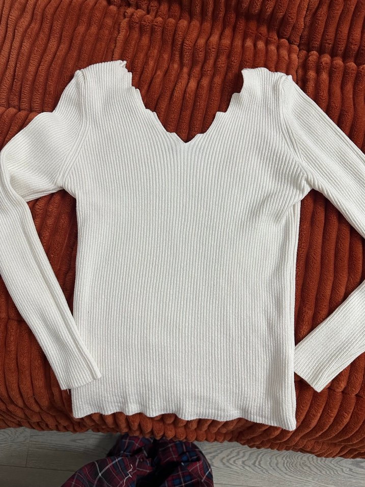 V yaka ve uzun kollu, beyaz triko kumaştan yapılmış, vücuda oturan kadın kazak. Sade ve desensiz tasarımıyla rahat sokak stili ve günlük kullanım için uygundur.