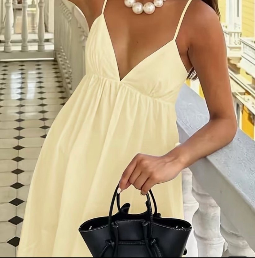 Terayağ sarısı, V yaka ve ince askılı uzun boy elbise, bol ve drapeli kesimiyle minimalist bohem tarzını yansıtıyor.