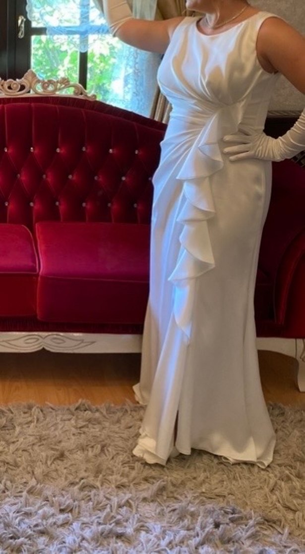 Beyaz, V yakalı, askılı, uzun ve oturan denizkızı gelinlik, modern klasik şıklığı katmanlı fırfır detaylarıyla sunar Eldivenleri de mevcut..