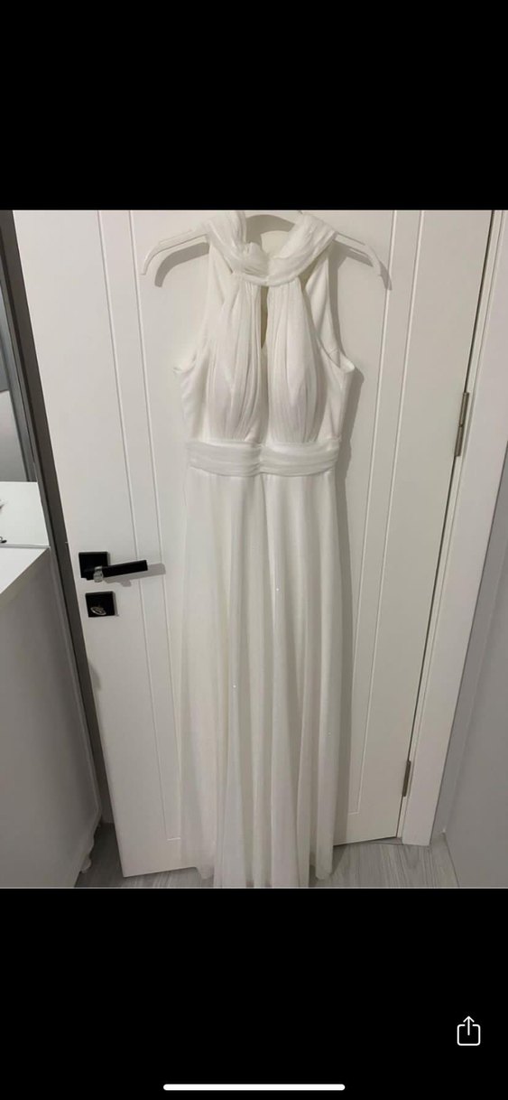 Beyaz, kolsuz, drapeli ve V yaka uzun abiye elbise. Düğünler için uygun, modern klasik ve minimalist şıklık sunar.
