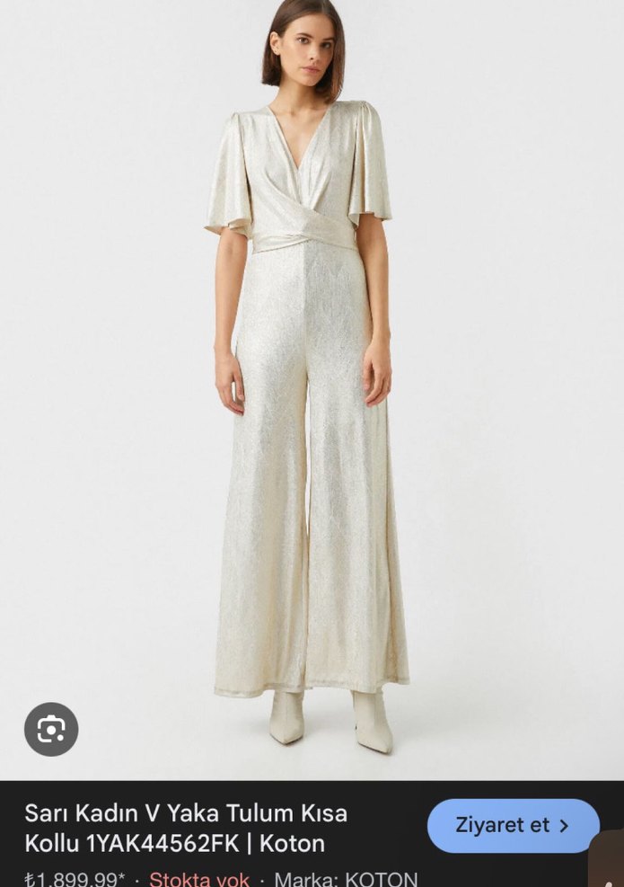 Parlak beyaz uzun kadın tulumu, kısa kollu ve V yakalı drapeli tasarıma sahip, dökümlü ve ipeksi kumaftan, düğünler için uygun. ✨