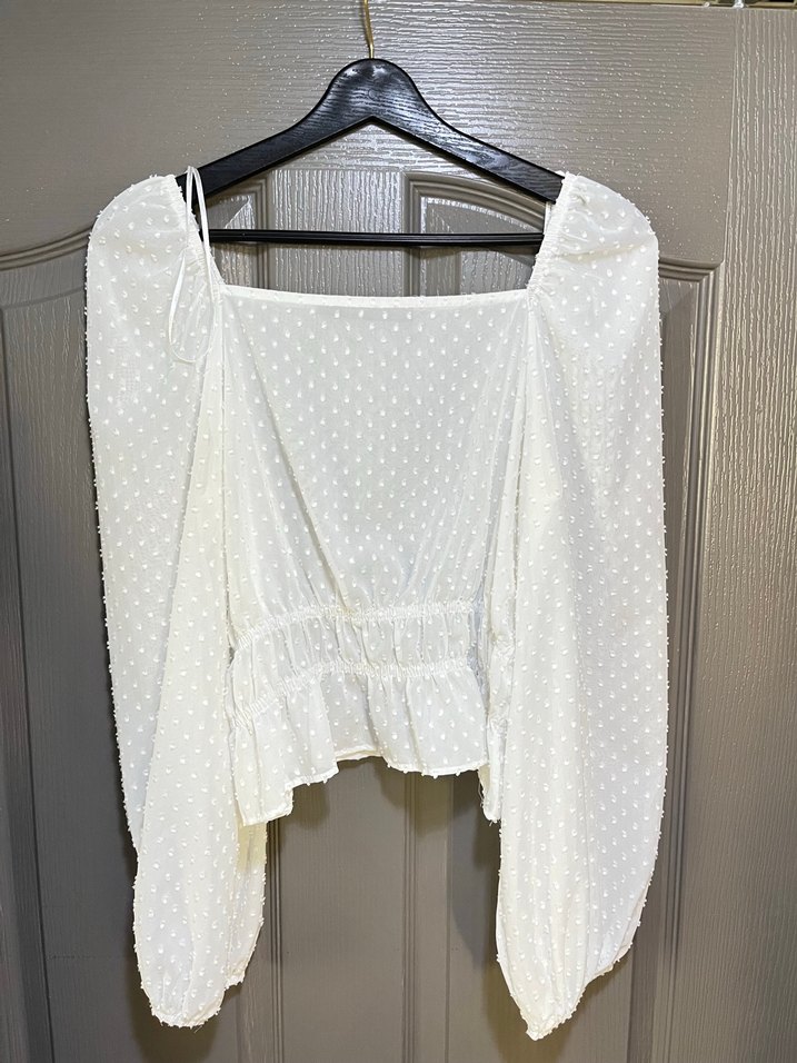 Beyaz, uzun kollu, V yakalı ve dökümlü detaylı bol kesim bluz. Hafif keten kumaştan, bohem tarz için uygun.
