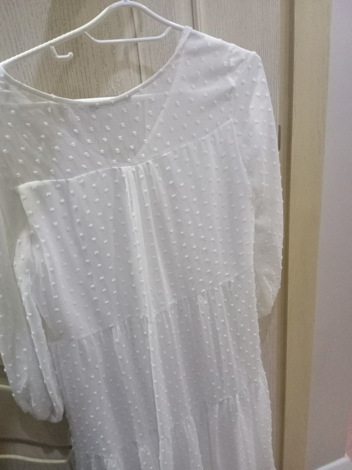 Beyaz uzun elbise, V yaka ve uzun kolludur. Yumuşak keten kumaştan, bol kesim ve fırfır detaylıdır. Günlük kullanıma uygundur. hamilelik ve dış çekim uygundur. bol kaliptir