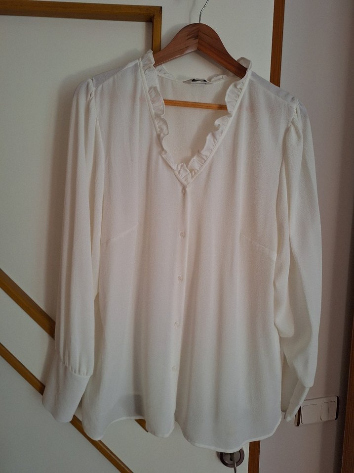 Beyaz keten kumaştan, düğmeli ve fırfırlı V yakalı, uzun kollu, bol kesim midi uzunluğunda kadın gömlek. Ofis kullanımı için uygun, trend casual tarzda. 44-46 bedene uygundur . alındı ama hiç giyilmedi temiz ve sağlam