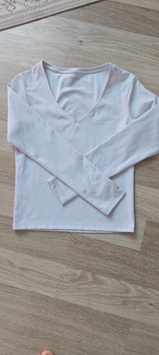 Beyaz, V yaka ve uzun kollu, vücuda oturan kesime sahip kadın tişörtü. Düz ve normal midi boyda, günlük kullanıma uygundur. Yumuşak sentetik kumaştan üretilmiştir.
