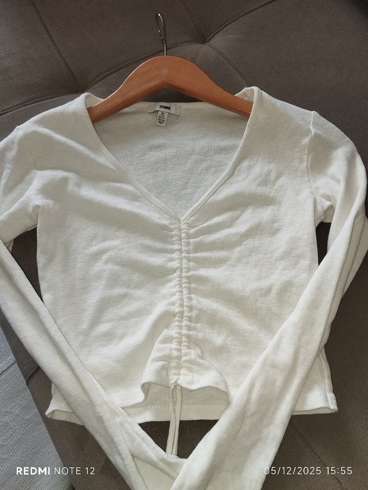 Beyaz keten kumaştan, uzun kollu ve V yaka, ön kısmı büzgülü, günlük rahat ve şık bir bluz#beyazbadi#beyazkısabadi#