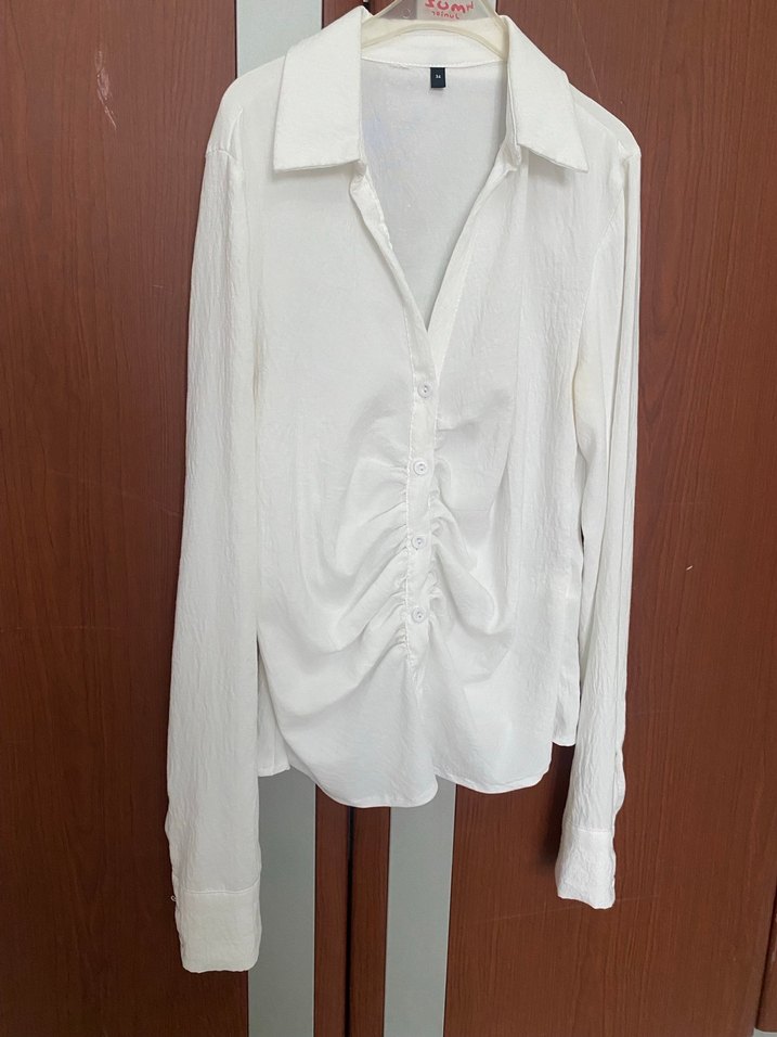 Beyaz keten gömlek, uzun kollu, V yaka ve düğmeli. Salaş kesim ve midi boy ile sade, günlük sokak stiline uygun.