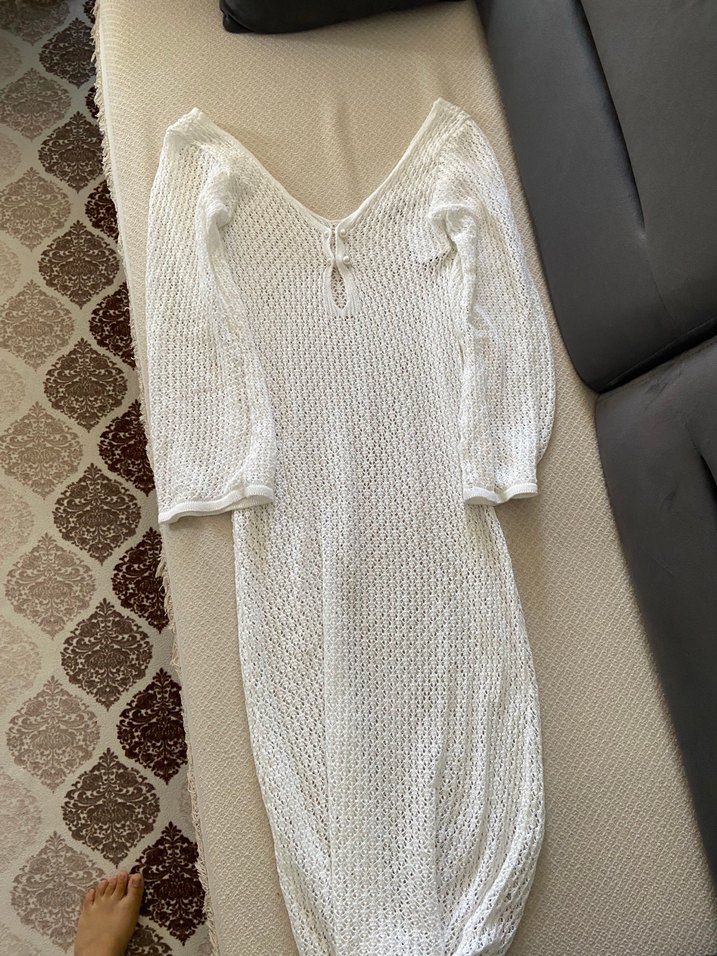 Beyaz renkli, uzun ve bol kesim, V yaka, uzun kollu, örgü dokulu bohem tarzda kadın elbise. Günlük kullanım için uygundur.