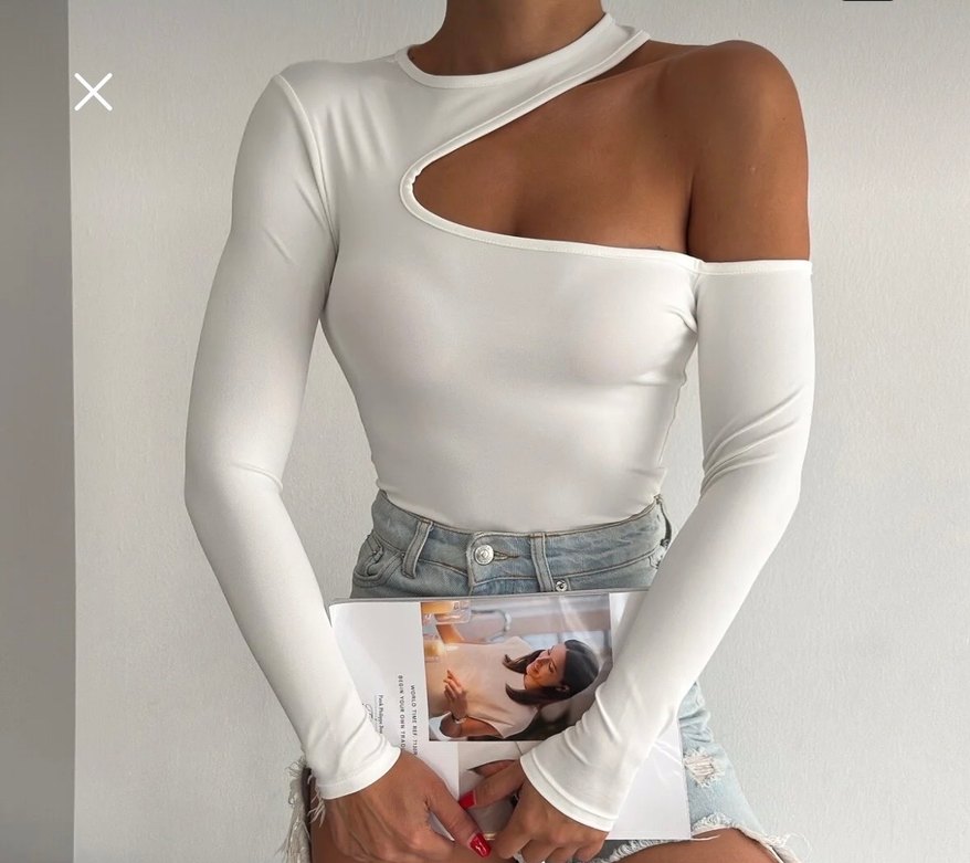 Beyaz, uzun kollu, asimetrik kesim V yakalı dar kesim bluz. Pürüzsüz sentetik kumaştan, günlük kullanım için modern sokak stili sunar. ✨
