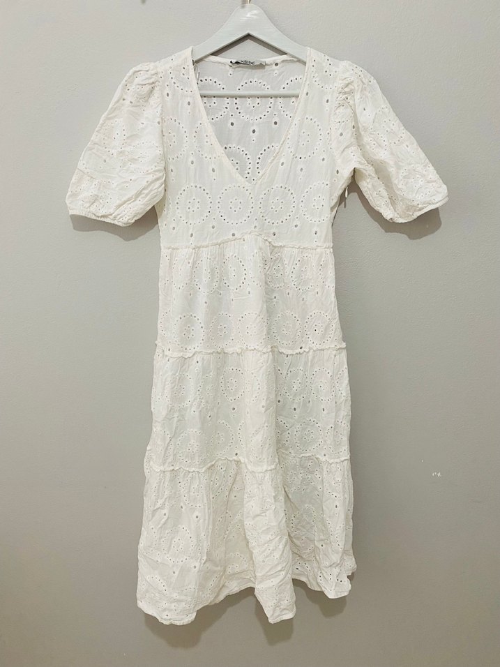 Beyaz V Yakalı Bohem Pamuklu Elbise