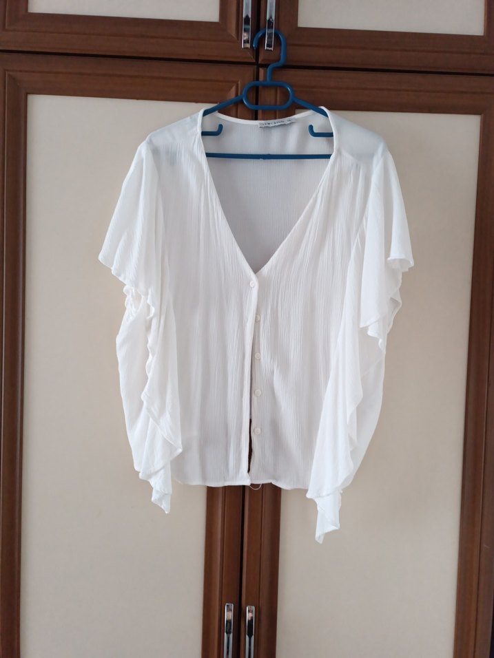 Beyaz kumaştan, V yakalı, bol kesim ve kısa kollu, midi uzunlukta, dökümlü kadın bluz. Bohem tarzı için uygun. omuz üzerindeki fırfırlar çok havalı