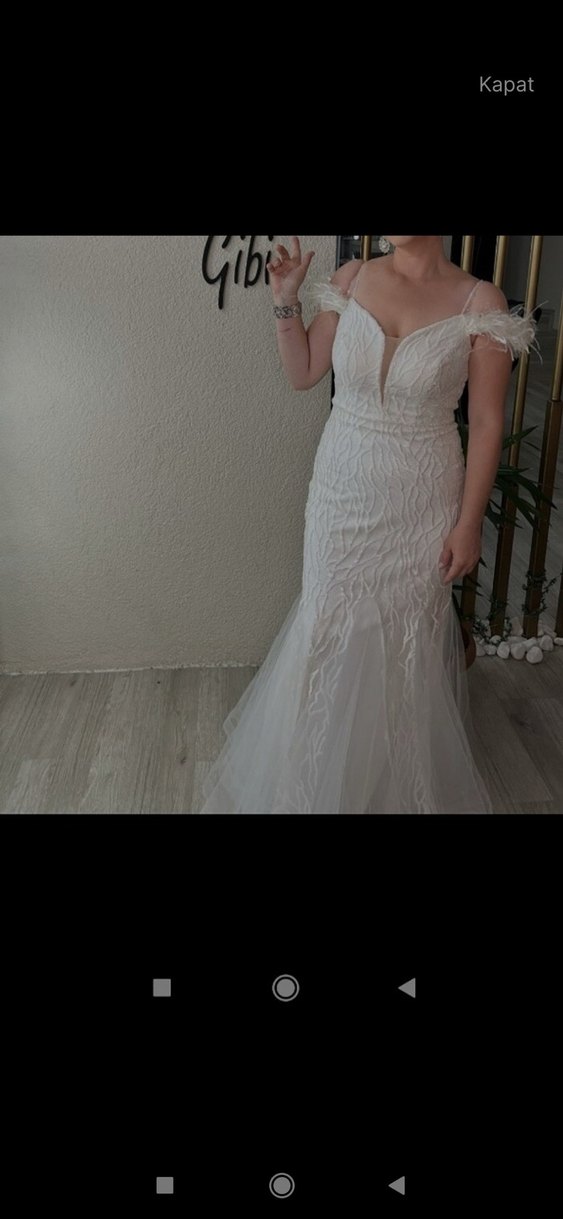 Bu beyaz denizkızı gelinlik, V yakalı ve askılı omuz detaylarıyla klasik şıklığı bohem ışıltıyla birleştirir. Sadece iki saat giyilmiştir temiz ve poşetli durumdadır