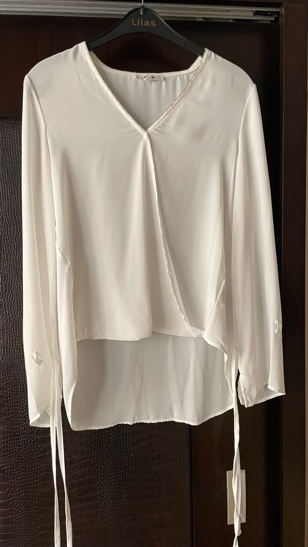 Beyaz, V yakalı, uzun kollu, kruvaze. Yaka kadın gömleği. Normal kesim ve midi boyda, yumuşak sentetik kumaştan üretilmiştir. Günlük kullanım ve gece için uygundur. ✨ Kruvaze yakası komple metal boncuk işlemeli tiril tiril bir bluz arkası önden biraz daha uzun tunik görünümlüdür