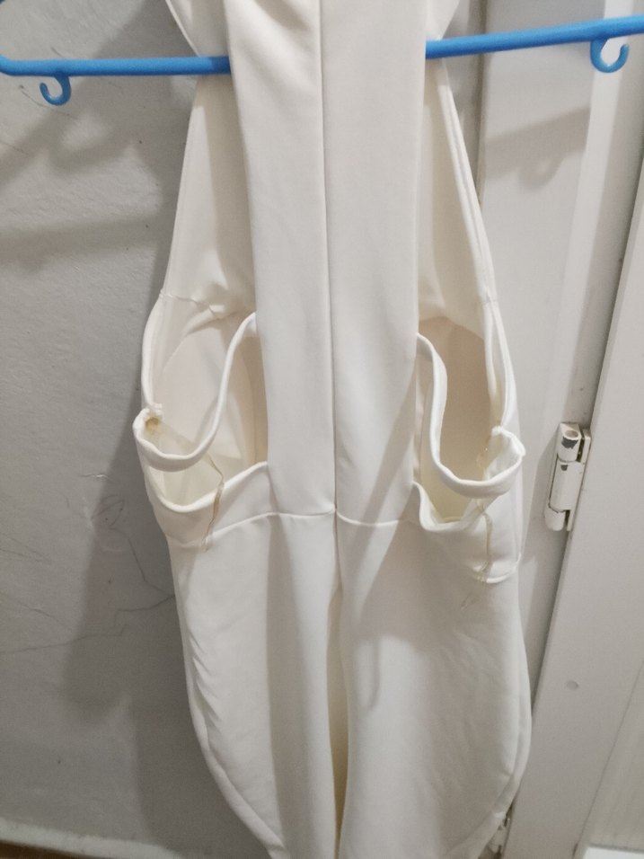 Kolsuz, v yakalı, drapeli beyaz tulum. Oturan kesim ve midi boy, minimalist sokak stili için uygundur.