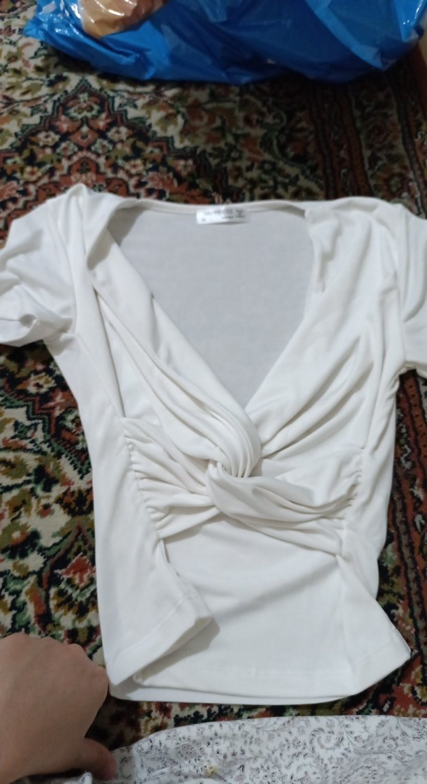 Beyaz renkli, V yakalı ve kısa kollu kadın bluz, drapeli ve vücuda oturan kesime sahiptir. Yumuşak sentetik kumaştan üretilmiş, kısa boyda günlük sokak stili için uygundur. ✨ 36 bedenn