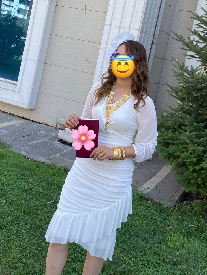 Beyaz, v yakalı, uzun kollu ve drapeli midi beyaz nikah vs elbisesi. Hafif tie-dye deseniyle bohem tarzını yansıtıyor. Marka temsilidir
