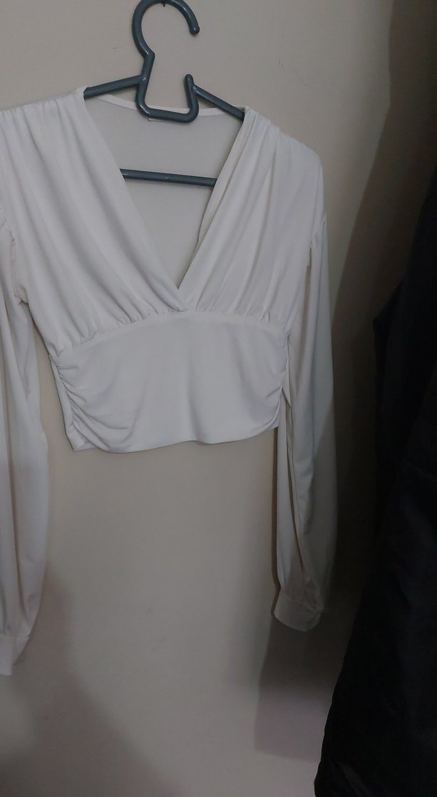 V yakalı, uzun kollu, drapeli beyaz bluz. Orta boyda, vücuda oturan kesim, yumuşak sentetik kumaştan yapılmıştır. Günlük sokak tarzı için uygundur.