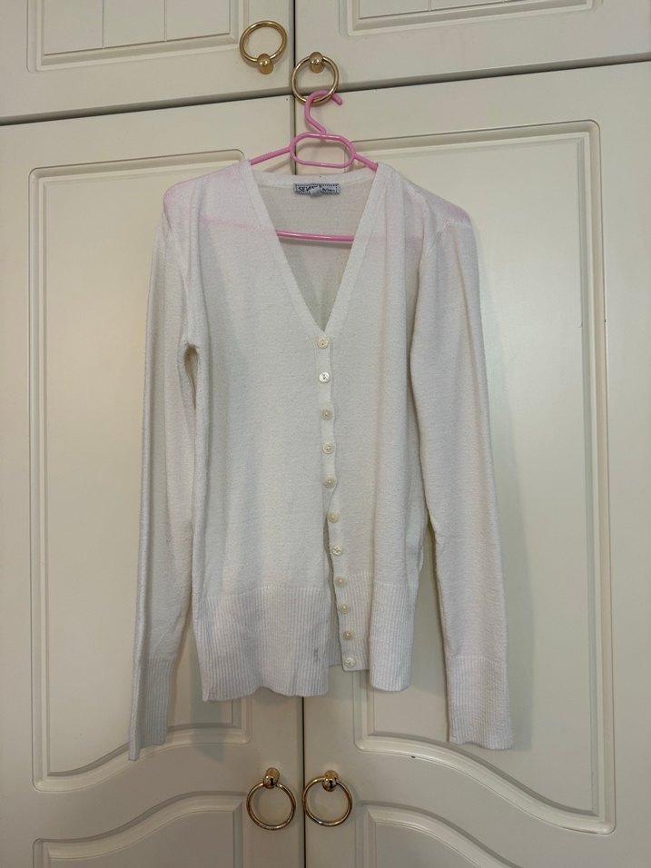 Krem renkte, V yakalı, düğmeli, uzun kollu pamuklu kadın hırkasıdır. Rahat kesim ve midi boydadır, günlük kullanıma uygundur. Fotoğrafta görüldüğü gibi hafif lekesi var.