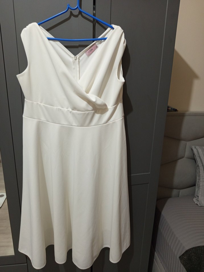 Drapeli V yakalı, kolsuz beyaz midi elbise, klasik şıklık için vücuda oturan kesimde, yumuşak sentetik kumaştan, düğünlerde tercih edilebilir.