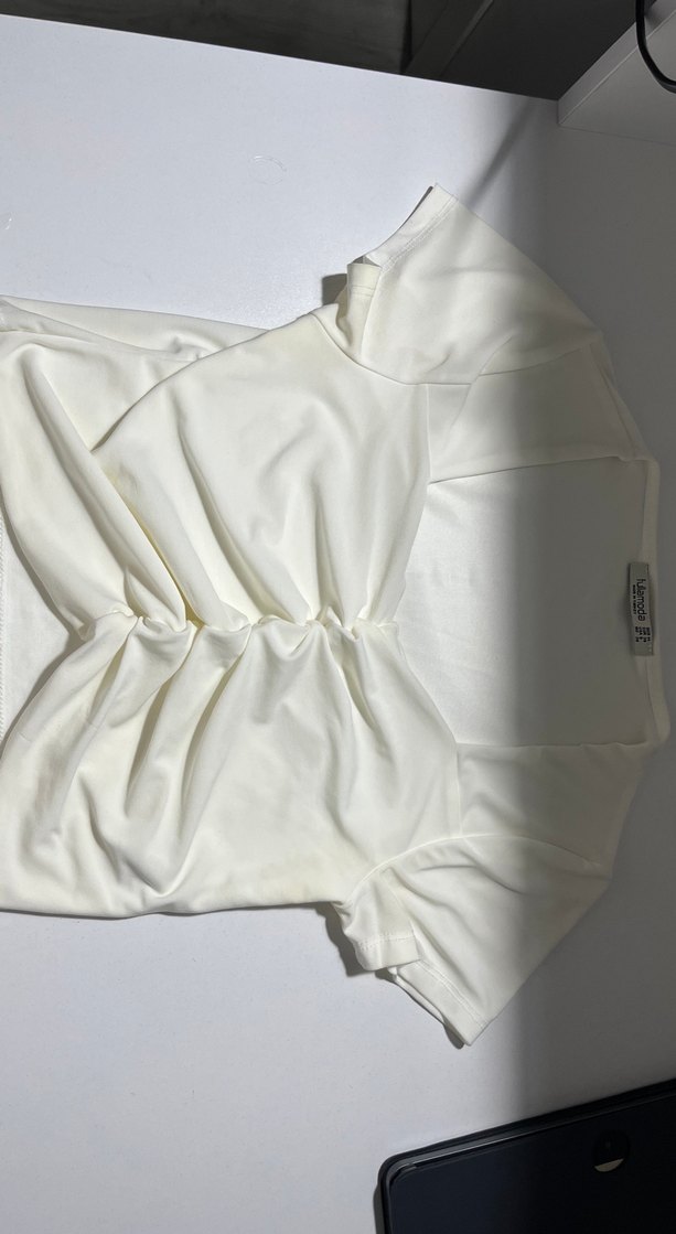 V yakalı, pileli ve kısa kollu, fit kesim kadın gömlek. Yumuşak sentetik kumaştan, pastel beyaz renkte, minimalist ve sokak stili için uygundur.