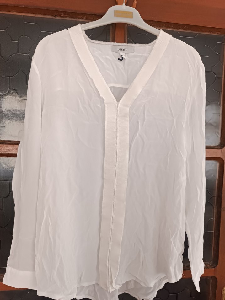 Beyaz keten kadın gömlek, V yakalı ve uzun kolludur. Salaş kesimi ve drapeli tasarımıyla minimalist sokak stiline uygundur.