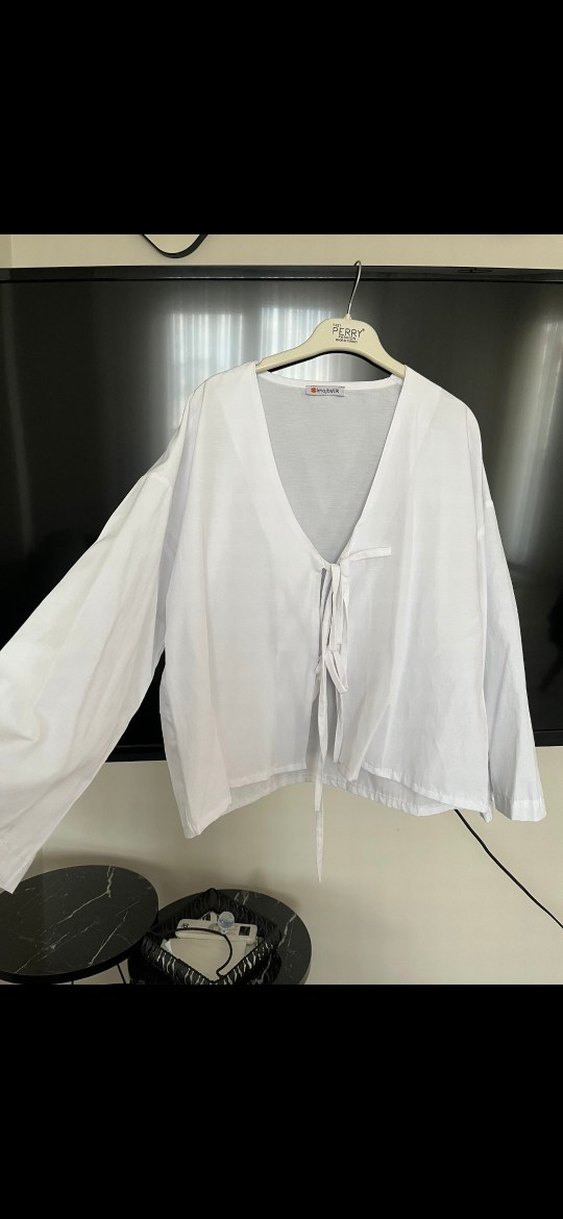 V yakalı, uzun kollu, keten kumaştan beyaz kadın gömleği. Salaş kesim ve drapeli, kısa boylu, minimalist normcore tarzda, şık ve rahat günlük kullanım için.
