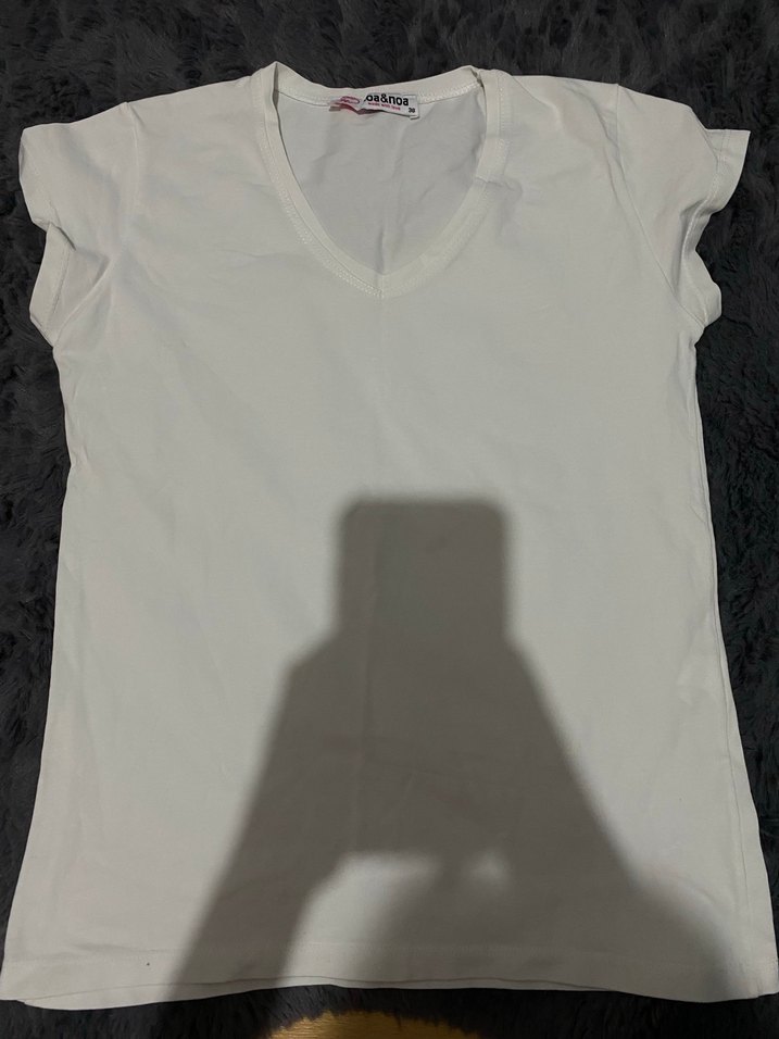 Pamuk kumaştan, V yakalı ve kısa kollu, beyaz, sade ve dar kesim kadın tişörtü. Günlük rahat ve sokak stili için uygundur. hiç giymedim