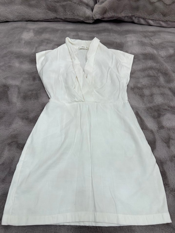 Beyaz V Yakalı Keten Midi Elbise