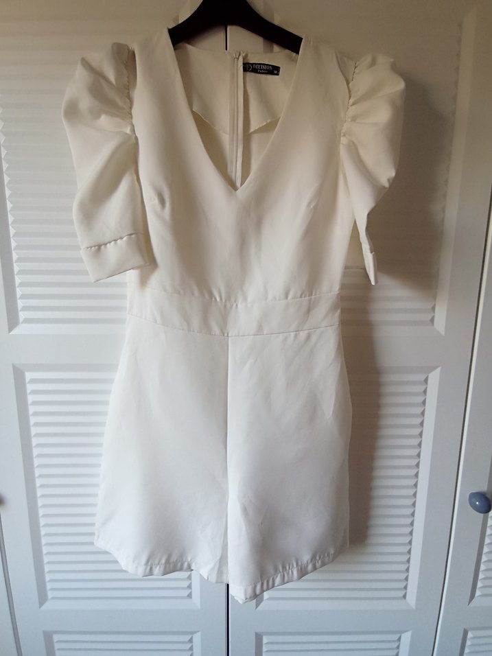 Beyaz keten tulum, V yakalı, kısa kollu ve drapeli detaylı, vücuda oturan kesimiyle şık bir sokak tarzı sunar.