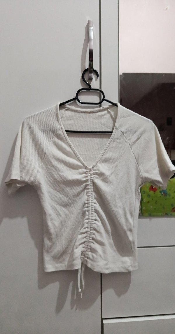 Beyaz, keten kumaştan yapılmış, V yakalı ve kısa kollu, beli büzgülü şık kesim gömlek. Rahat ve gündelik tarz için idealdir.