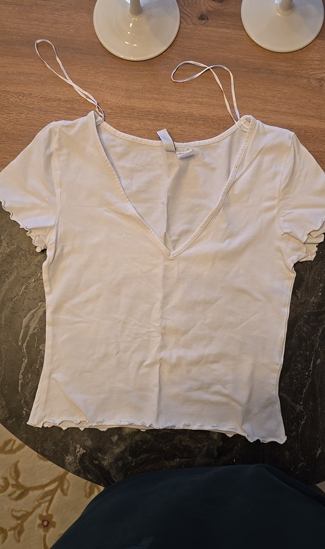 Beyaz, V yakalı ve kısa kollu, kısa kesim, sade tasarımlı, minimalist sokak stili bluz. Günlük kullanıma uygundur.