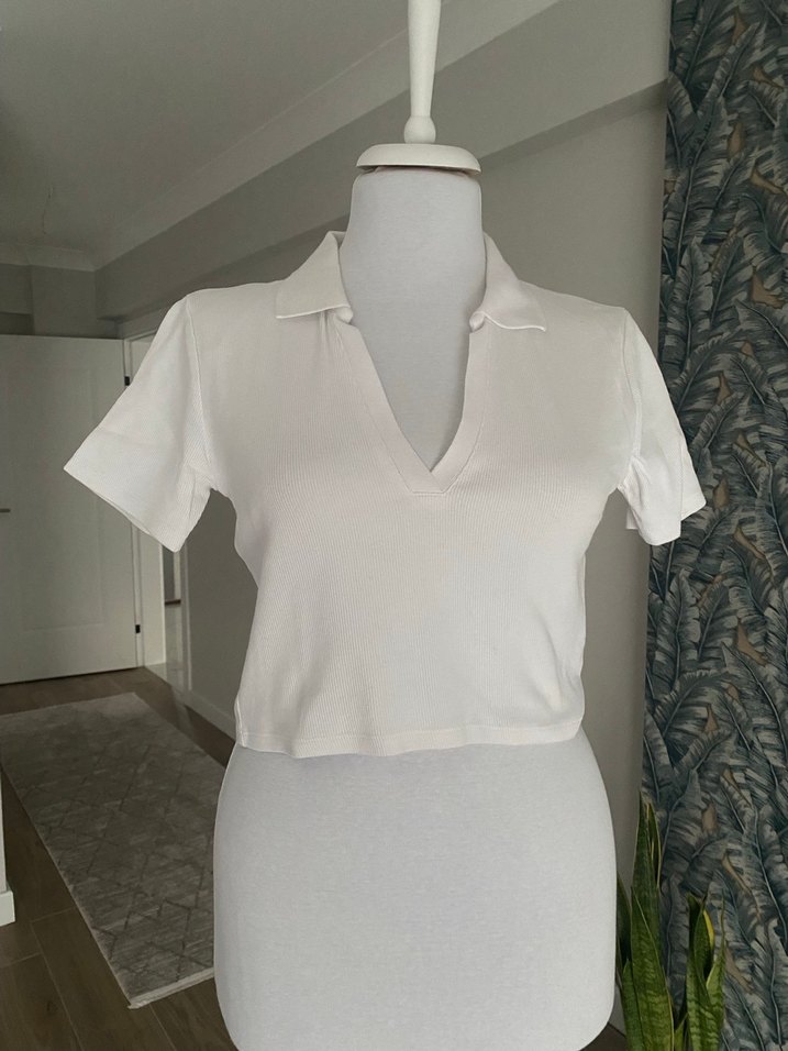 Beyaz V Yakalı Kısa Kollu Kadın Tişört