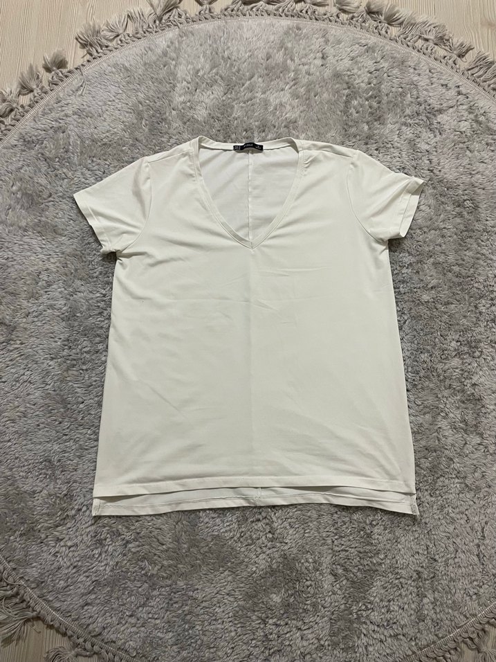 Beyaz, v yakalı, kısa kollu, bol kesim kadın tişörtü. Düz ve sade tasarımıyla günlük kullanıma uygun, sentetik kumaştan üretilmiştir. leke mevcut değildir