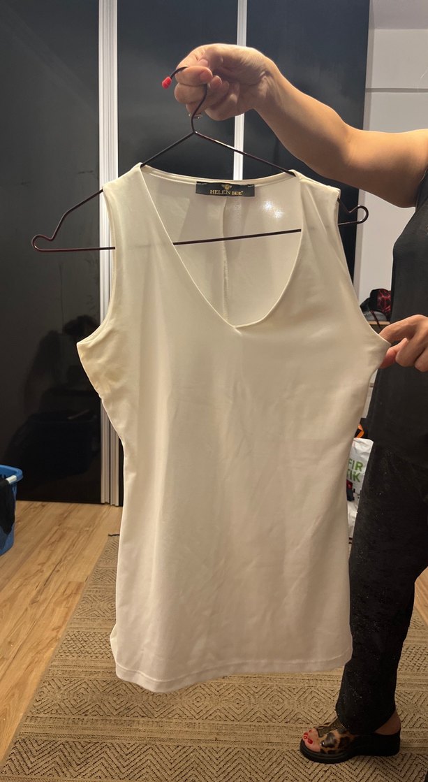 Beyaz, V yakalı, kolsuz bluz. İnce ve parlak kumaştan, midi boyda, sade ve şık bir sokak stili sunar. ✨