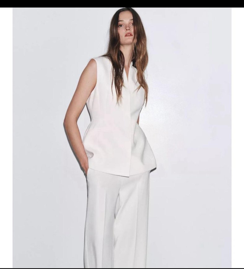 Beyaz, kolsuz ve V yakalı midi elbise, ipeksi kumaştan yapılmış. Minimalist ve desen içermeyen tasarımıyla ofis için uygun, rahat kesim.