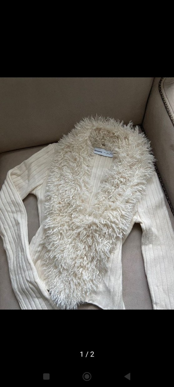 Uzun kollu ve V yakalı, yumuşak kürk detaylı beyaz kadın kazak. Sıcak yünden üretilmiş, kısa boyda ve dar kesimdir. xs - s bedenler tercih edebilir