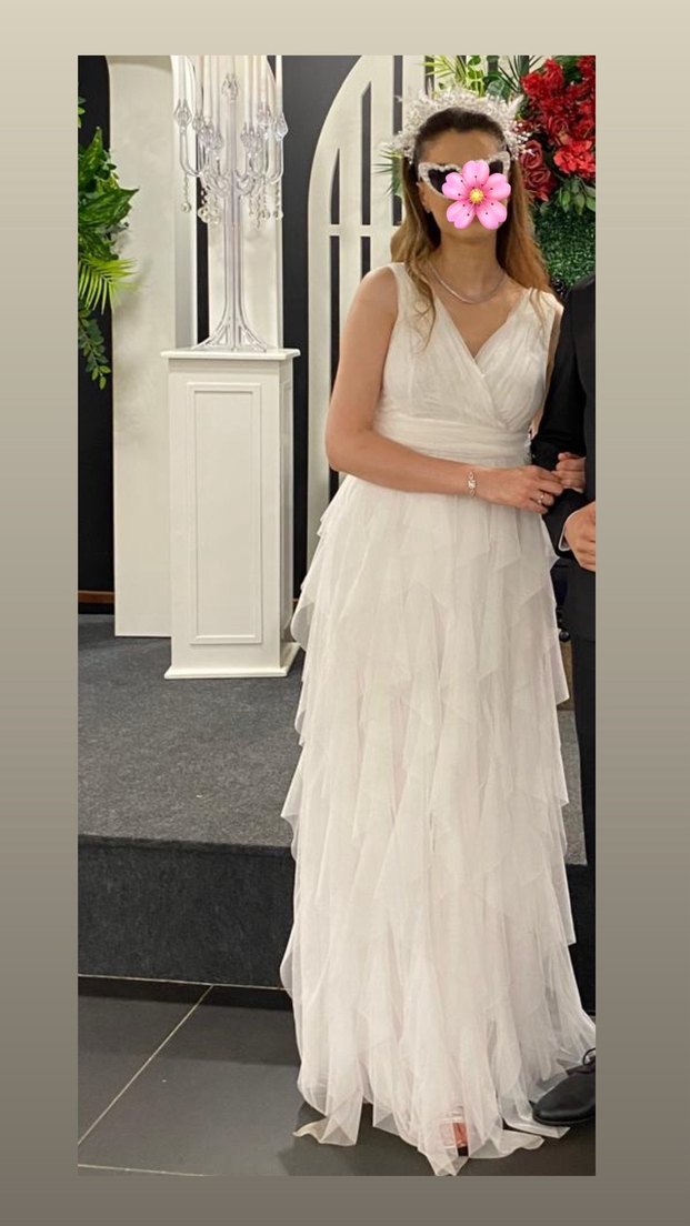 V yakalı, askılı ve midi boyda, vücuda oturan A-line gelinlik. Katmanlı etek ve klasik zarafetle modern Paris tarzını yansıtıyor. After elbisesi olarak kullandım.