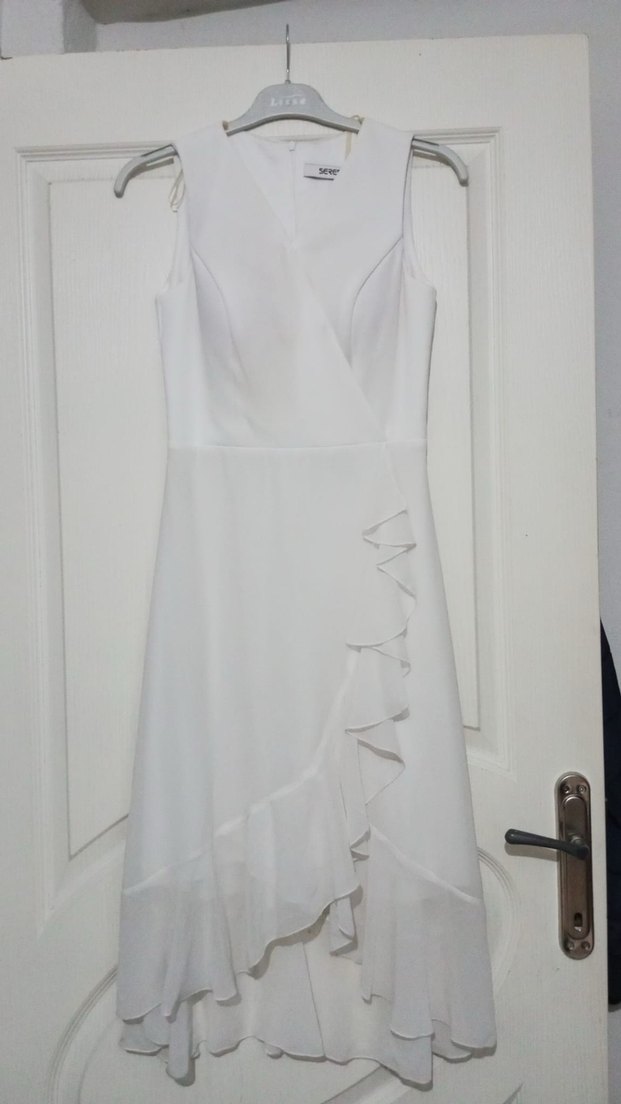 Kolsuz, V yakalı beyaz midi elbise, fırfır detayıyla modern ve minimalist bir tarz sunar. Düğünler için uygun, rahat kesim ve hafif kumaş.