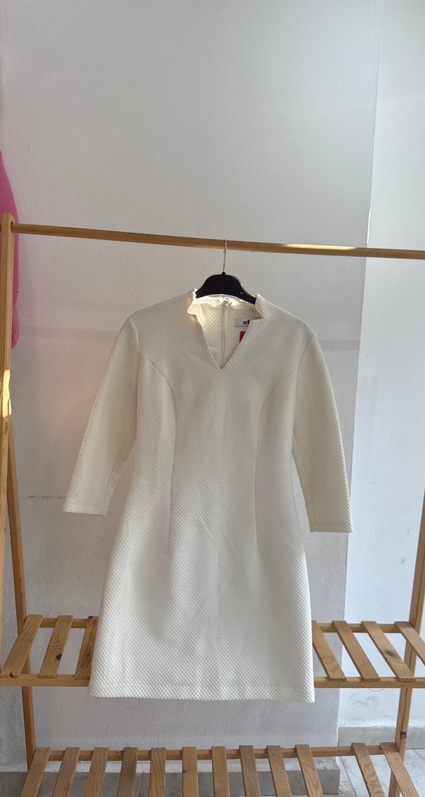 Beyaz midi elbise, V yaka ve kısa kolludur. Pliseli tasarımı ve düz dokusu ile sade, modern klasik stile sahiptir. Günlük kullanıma uygundur.