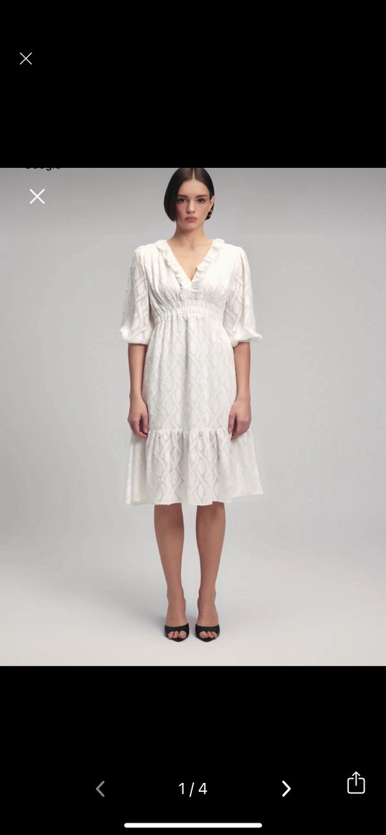 Beyaz midi elbise, V yakalı ve fırfır detaylı, yumuşak pamuktan yapılmıştır. Salaş kesim ve askılı kollarıyla modern klasik ofis tarzına uygundur. Bir defa çeyiz çıkarmada giydim #nikahelbisesi #düğünelbise #mezuniyetelbise #uzunelbise #midielbise #nikahelbise