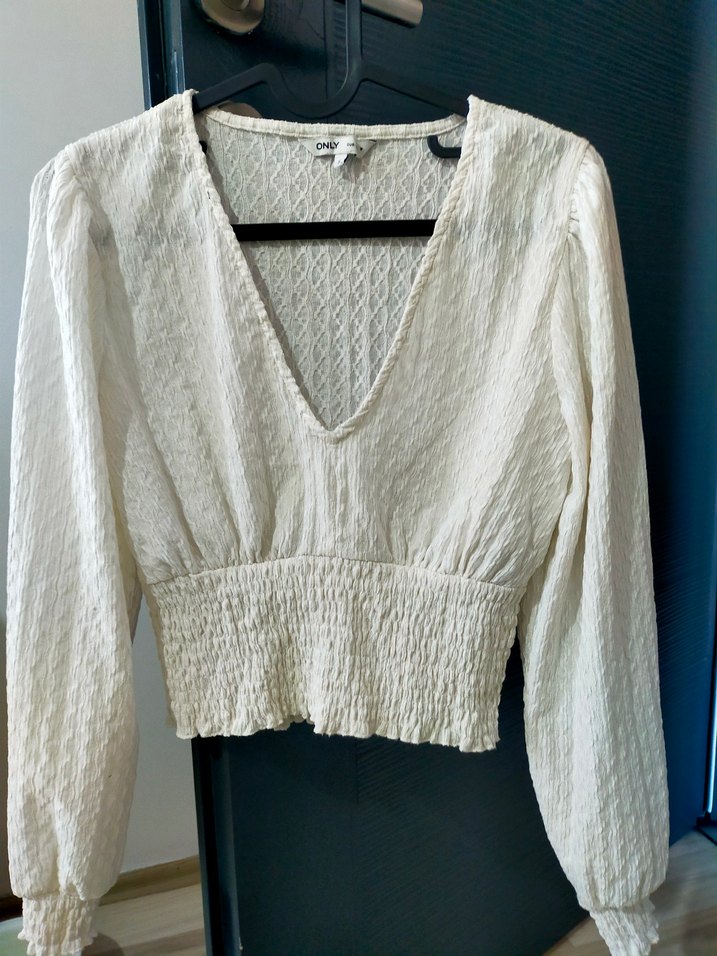 Beyaz renkli, V yakalı ve uzun kollu bu bluz, yumuşak keten kumaştan örme dokusuyla yapılmıştır. Bol kesim ve beli büzgülü, bohem tarzda günlük kullanım için uygundur.