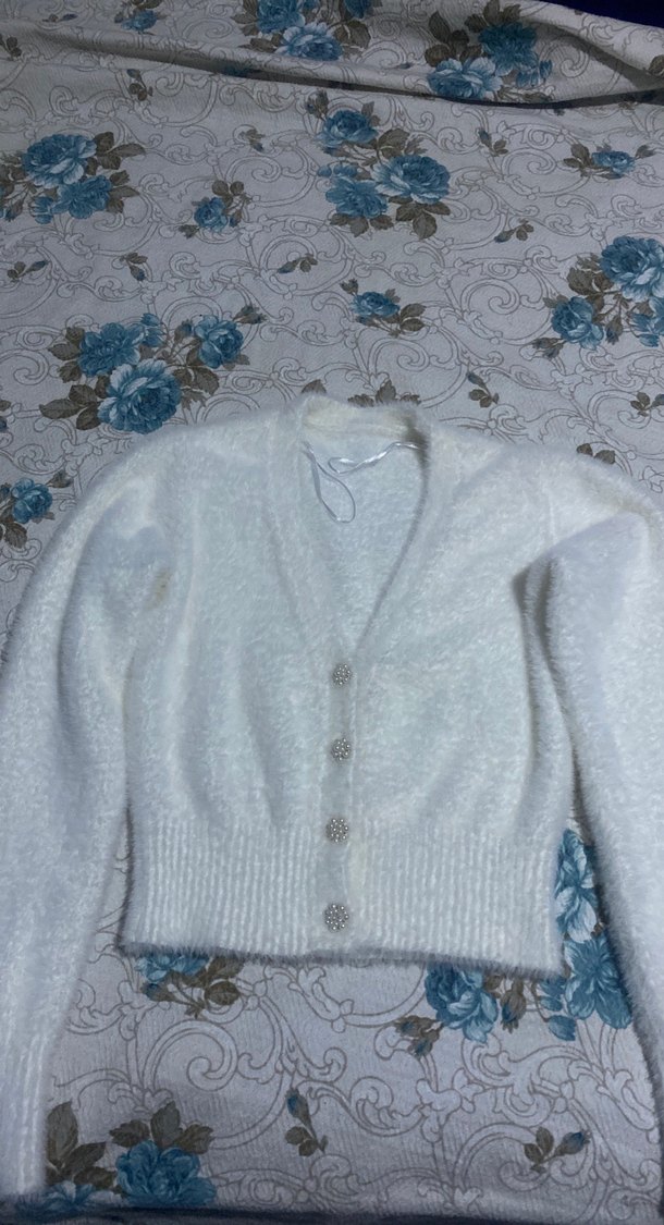 Beyaz örgü kadın hırka, V yakalı ve uzun kolludur. ve normal midi boyda, rahat sokak stili için uygundur. Desensiz ve konforludur, günlük kullanım için idealdir. Defosu yoktur 1 2 kere giyildi