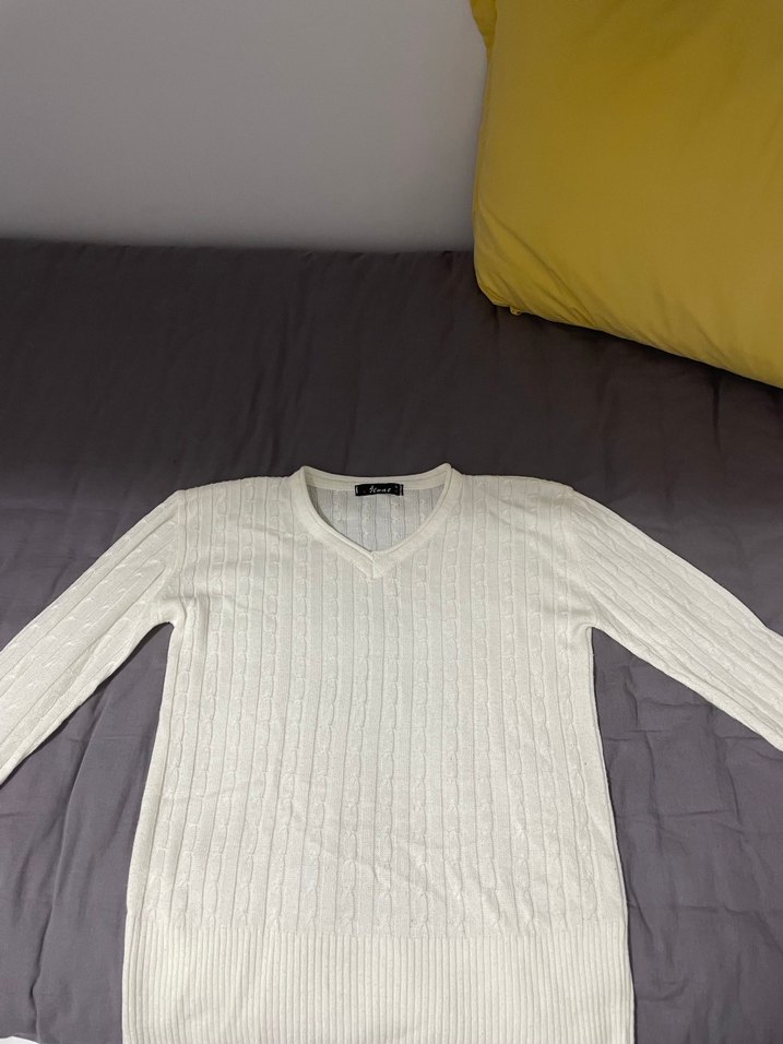 Beyaz renkli, V yakalı ve uzun kollu örgü kadın triko. Yumuşak keten kumaştan, günlük rahat kullanım için regular fit ve minimalist tarzda.